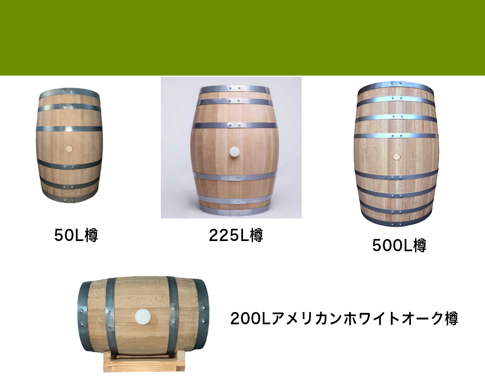 50Lはシェリー樽・ワイン樽、 500Lは米国産、フランス産、 ウイスキー用木樽については、 米国産ホワイトオーク、フランス産オーク、 シェリー樽・ワイン樽等を取り揃えています。
