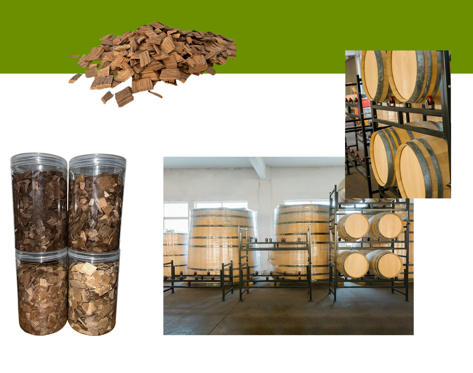 左:フレンチオークチップ (上:ヘビートースト、下:ミディアムトースト) 右:アメリカンホワイトオークチップ (上:ヘビートースト、下:ミディアムトースト) 金属ラック